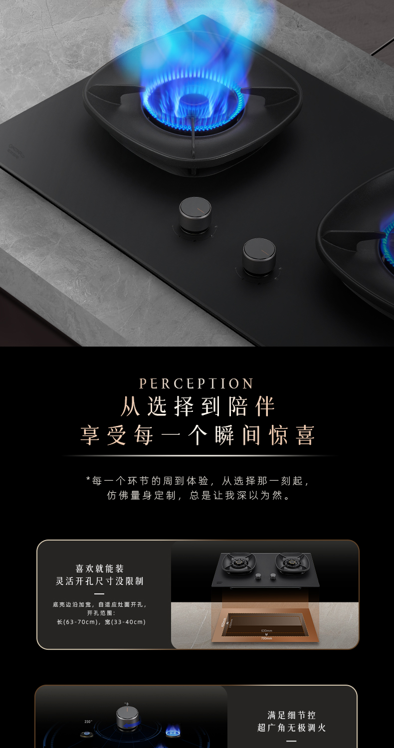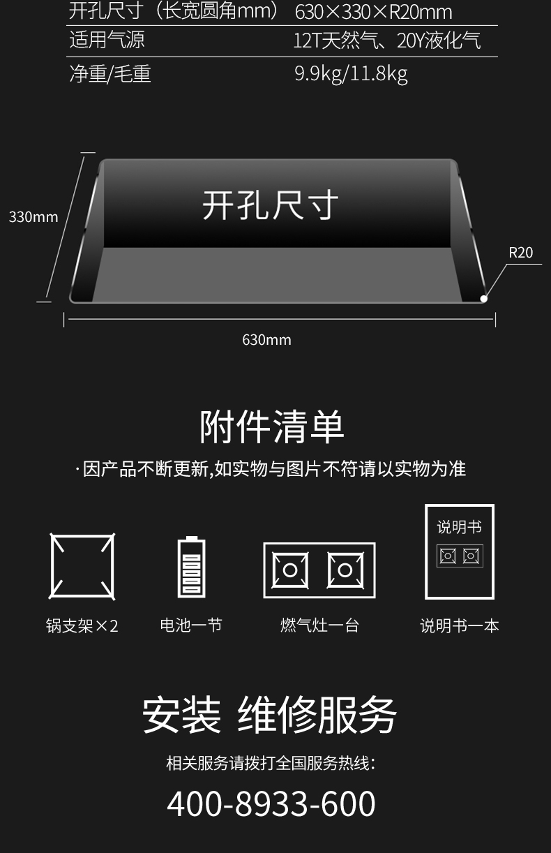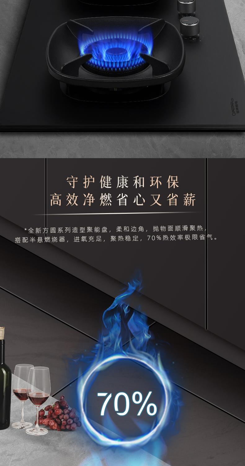 1、带聚能盘精悍雾面搪瓷锅支架,聚能防滑隔热一体 2、铜火盖+铝底座(火盖不可取) 3、新分体式燃烧器,可取易洁无死角 4、铝合金双色旋钮+密封旋钮底座 5、精工制造黑色彩钢盛液盘 6、125mm大尺径、精车边炉头 7、瞬燃点火 热负荷kw:12T(5.2kw)/20Y(5.0kw) 热效率:12T(1级70%)/20Y(1级66%) 整机尺寸:780×450×160mm 开孔尺寸:630×330mm 4-R20