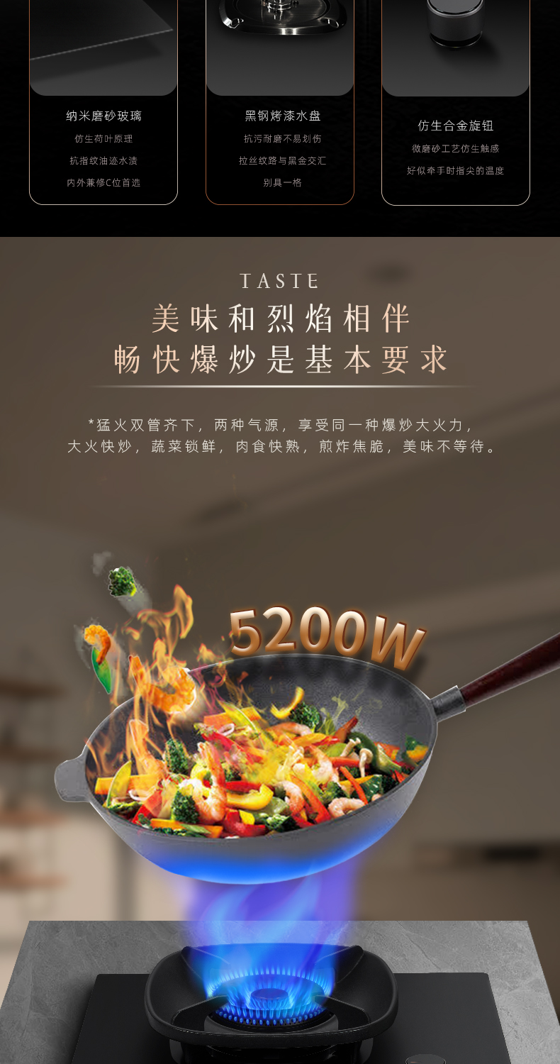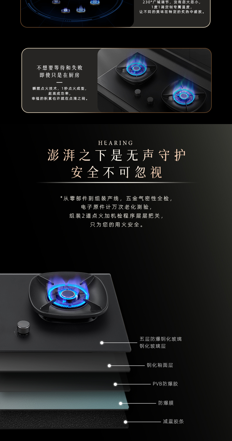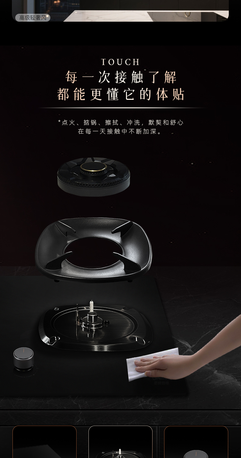 1、带聚能盘精悍雾面搪瓷锅支架,聚能防滑隔热一体 2、铜火盖+铝底座(火盖不可取) 3、新分体式燃烧器,可取易洁无死角 4、铝合金双色旋钮+密封旋钮底座 5、精工制造黑色彩钢盛液盘 6、125mm大尺径、精车边炉头 7、瞬燃点火 热负荷kw:12T(5.2kw)/20Y(5.0kw) 热效率:12T(1级70%)/20Y(1级66%) 整机尺寸:780×450×160mm 开孔尺寸:630×330mm 4-R20