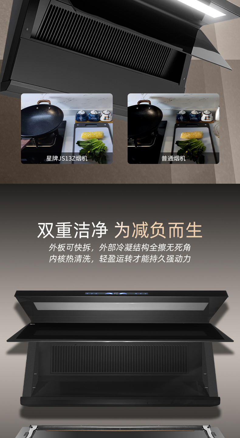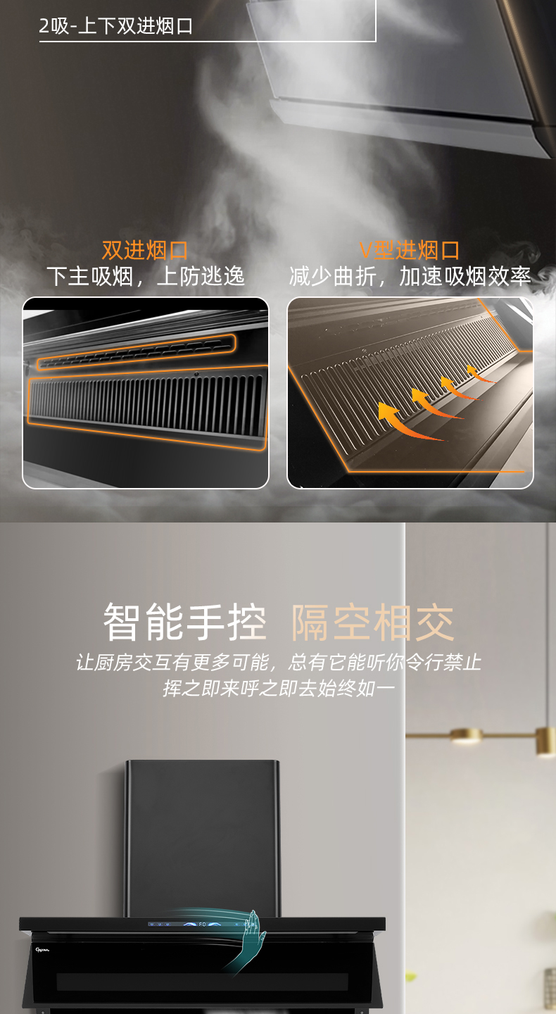 4、翻板速吸设计,两段式电动开合,较固定进烟口提速15%