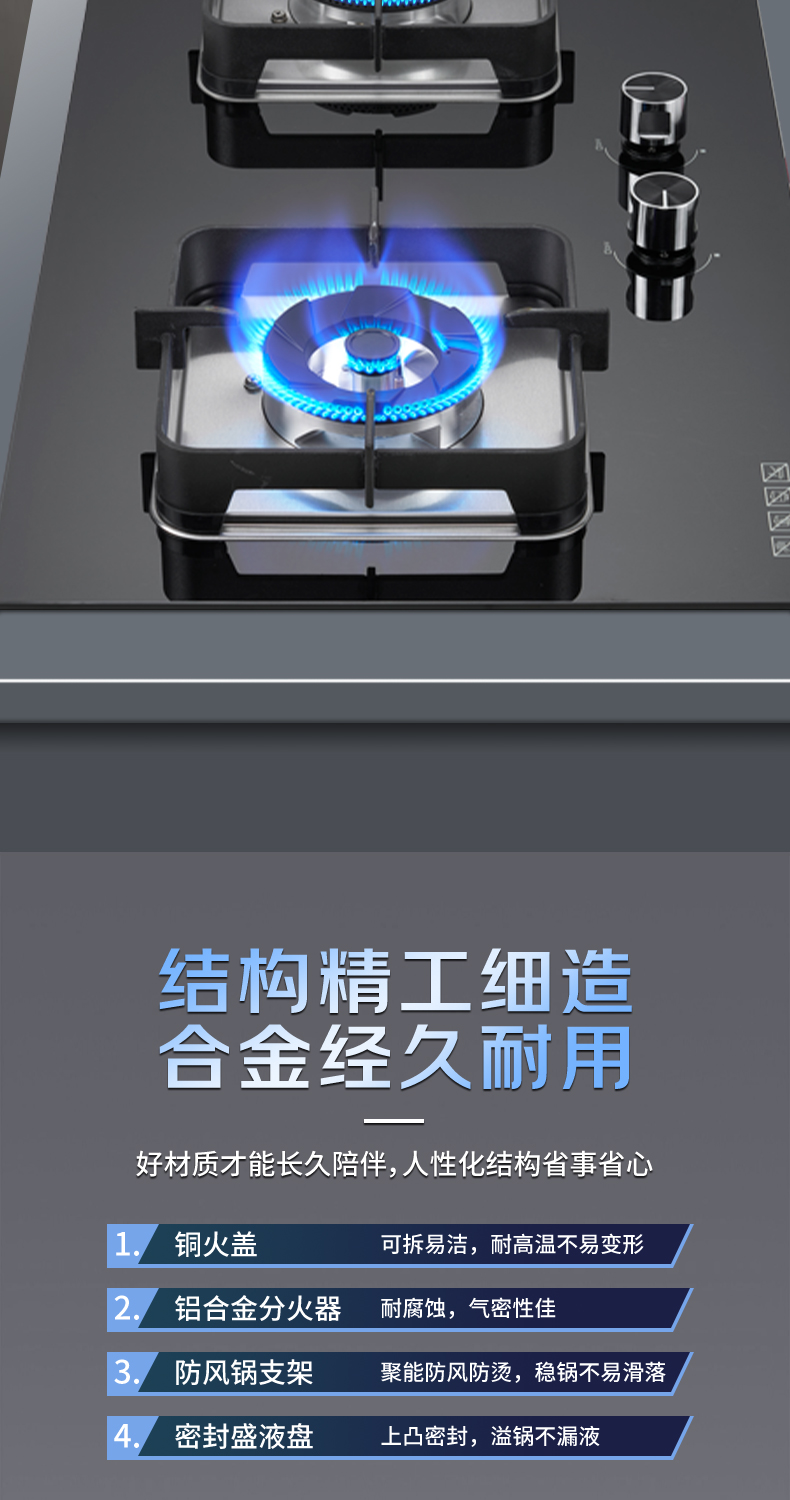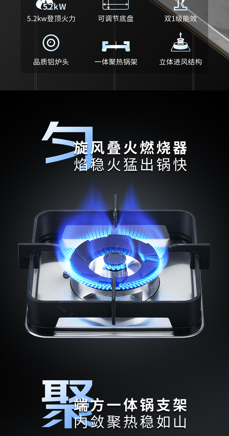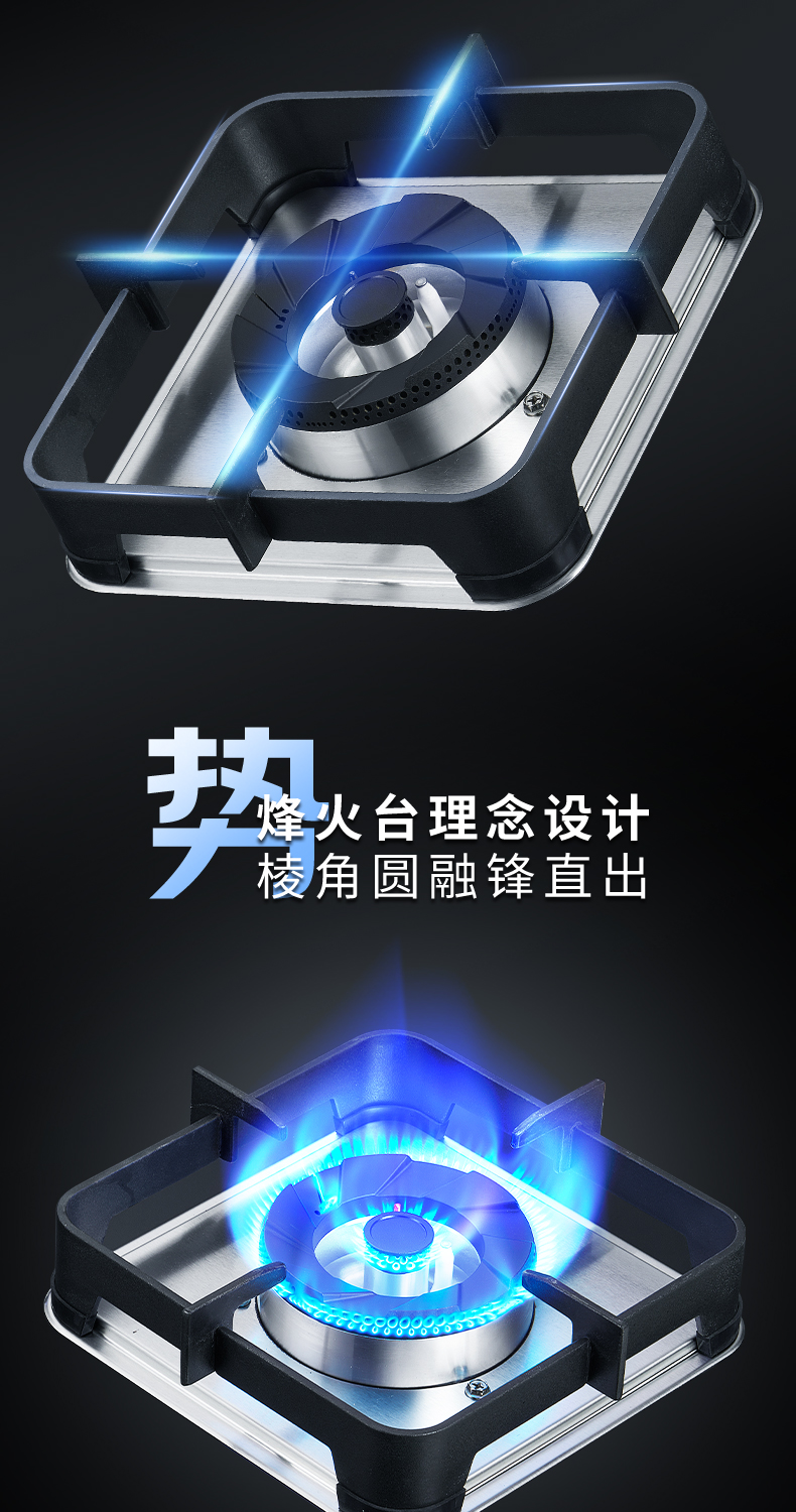 1、精悍雾面搪瓷十字锅架,加厚聚热围板,脚垫防滑防刮 2、内外铜火盖+铝底座,一体式燃烧器 3、柱形防滑CD纹双色合金旋钮+密封旋钮底座