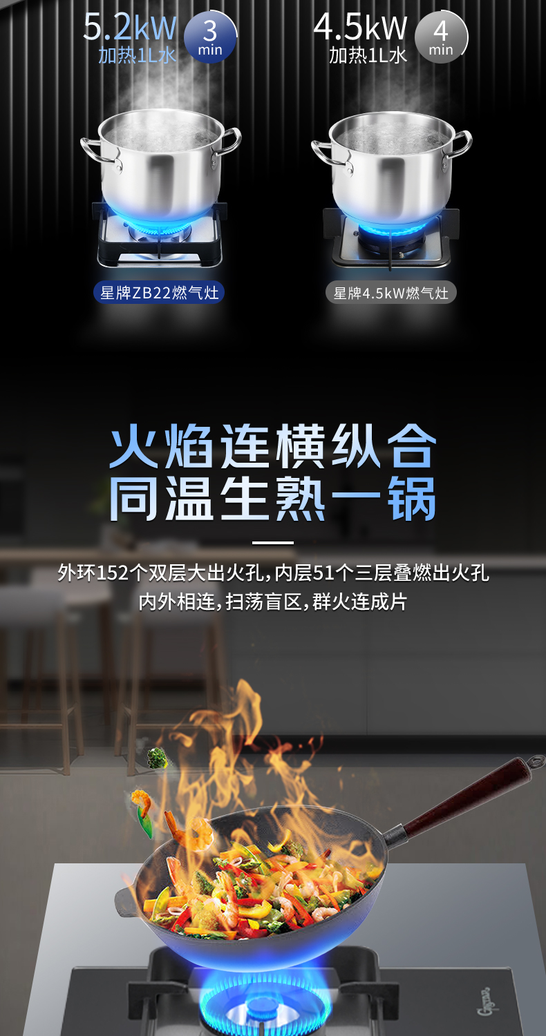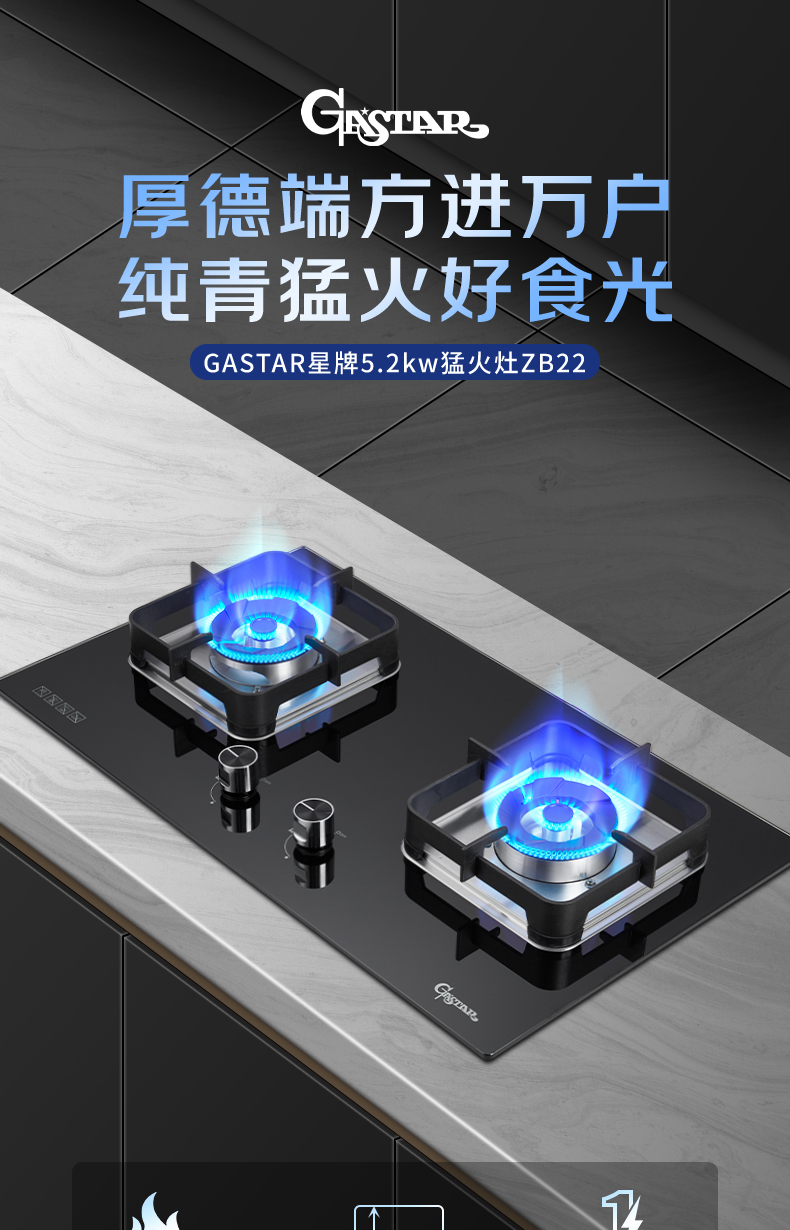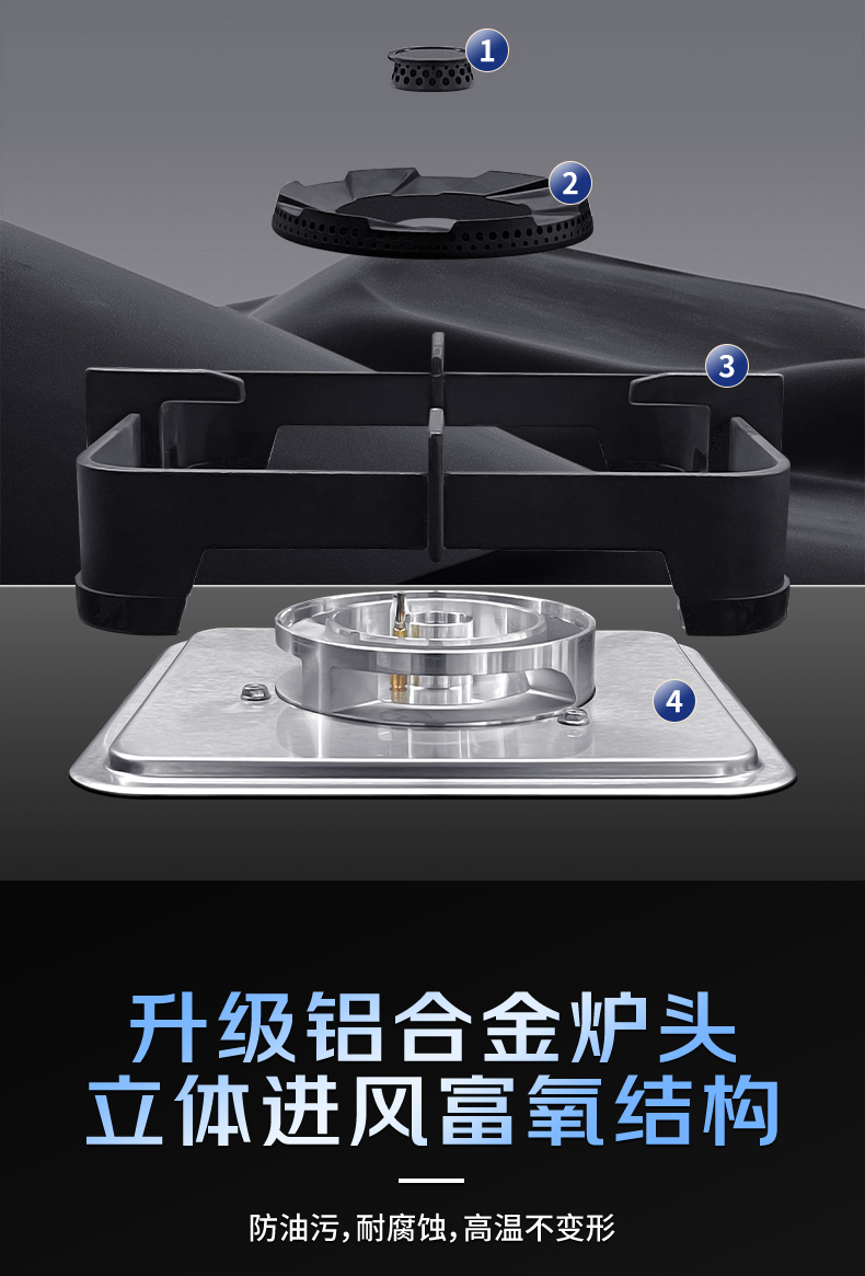 1、精悍雾面搪瓷十字锅架,加厚聚热围板,脚垫防滑防刮 2、内外铜火盖+铝底座,一体式燃烧器 3、柱形防滑CD纹双色合金旋钮+密封旋钮底座