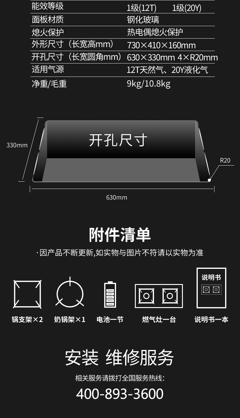 热负荷kw:12T(5.2kw)/20Y(5.0kw) 热效率:12T(1级63%)/20Y(1级63%) 整机尺寸:730×410×160mm 开孔尺寸:630×330 4-R20