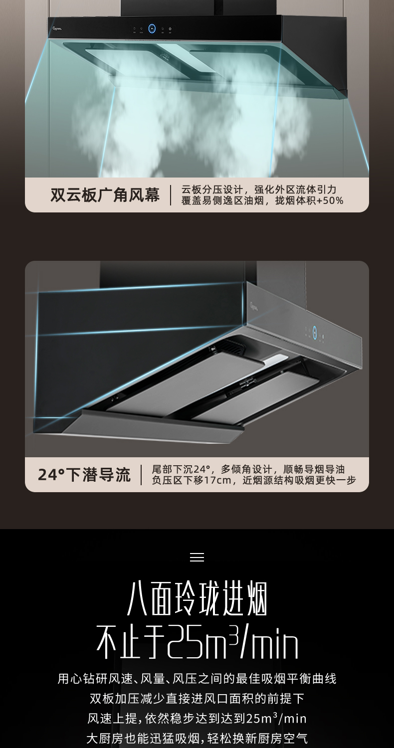 2、双云板广角拢烟,24°下潜负压下移导流