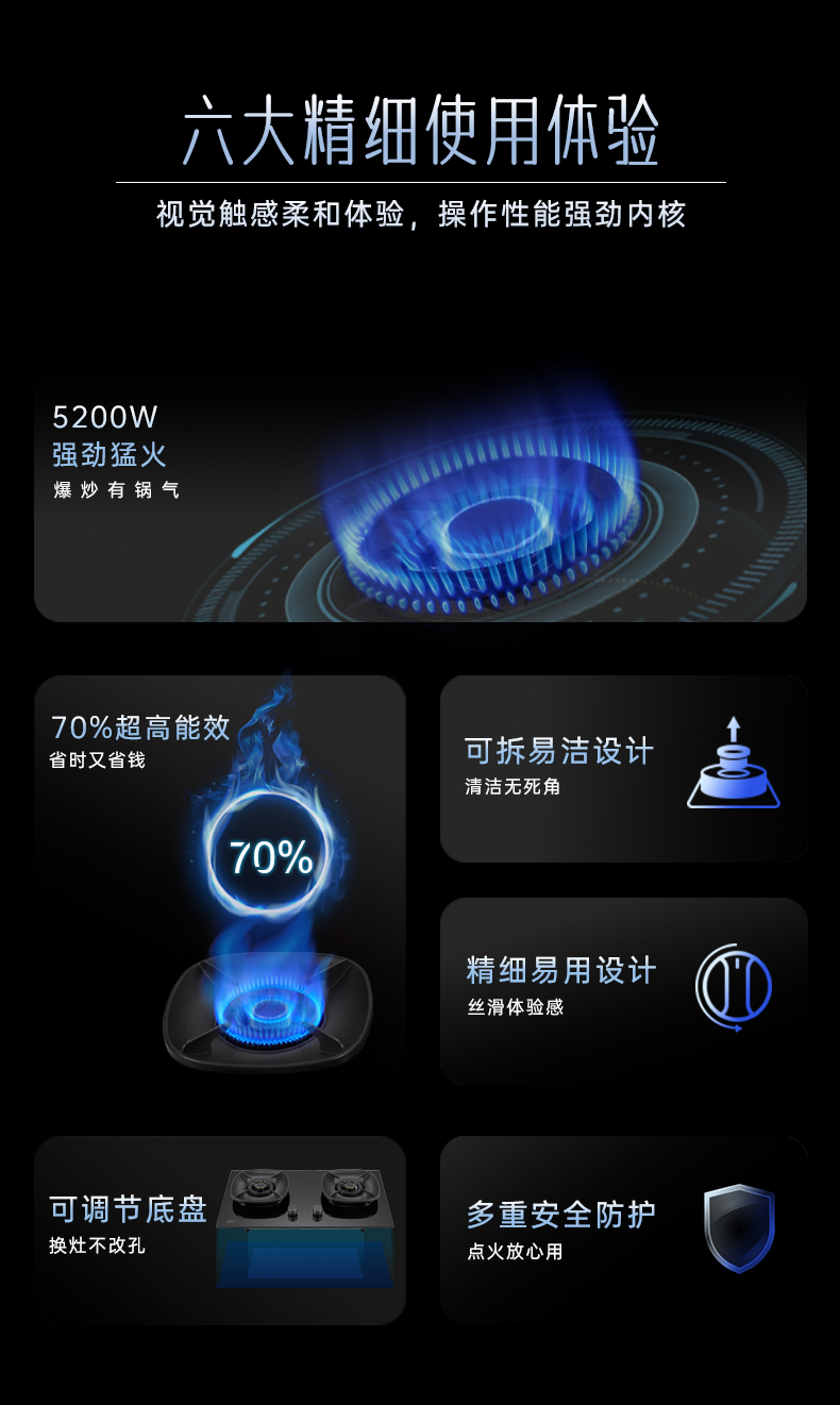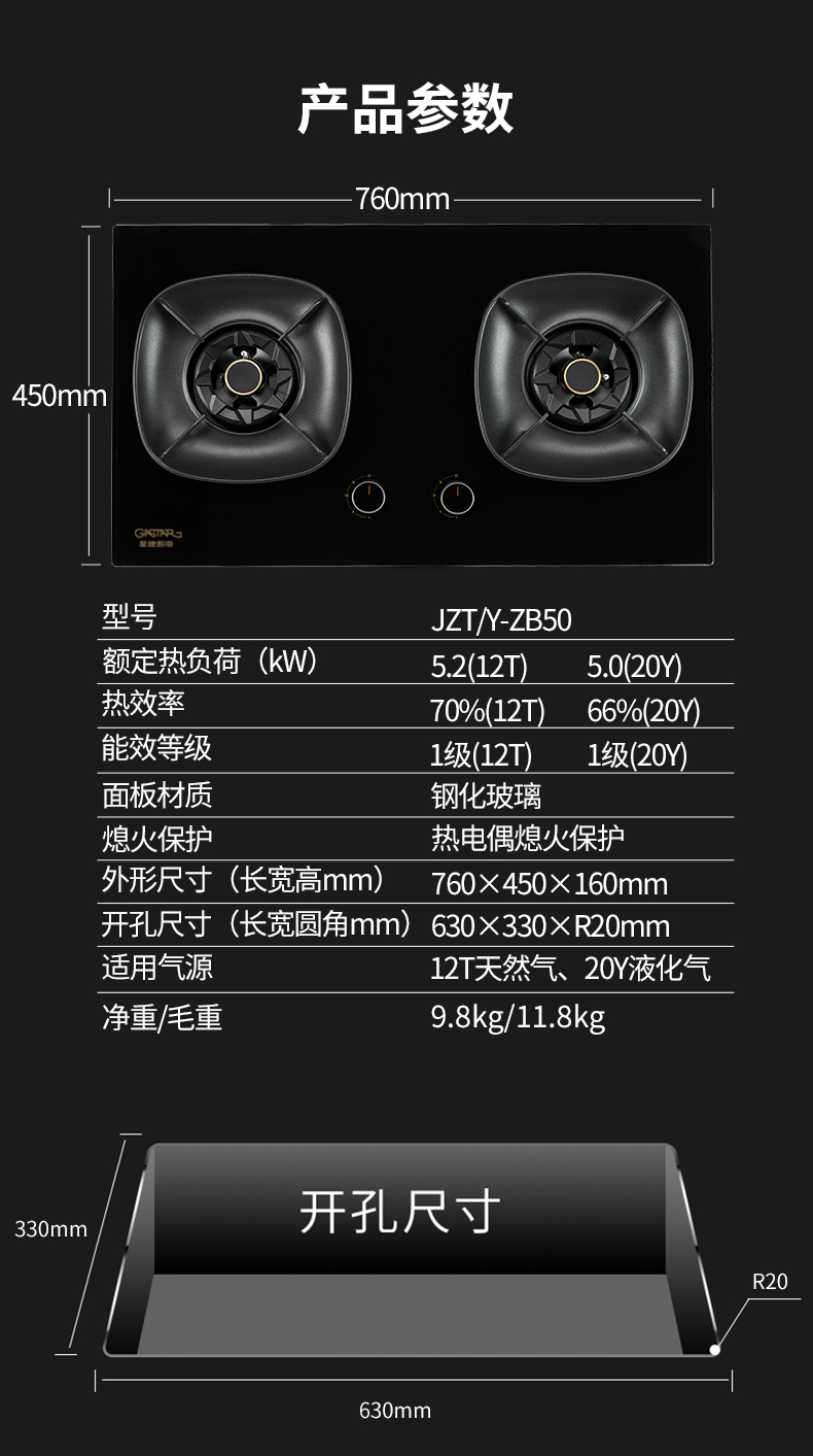 1、带聚能盘精悍雾面搪瓷锅支架,聚能防滑隔热一体 2、铜火盖+铝底座(火盖不可取) 3、新分体式燃烧器,可取易洁无死角 4、铝合金双色旋钮+密封旋钮底座 5、精工制造黑色彩钢盛液盘 6、125mm大尺径、精车边炉头 热负荷kw:12T(5.2kw)/20Y(5.0kw) 热效率:12T(1级70%)/20Y(1级66%) 整机尺寸:760×450×160mm 开孔尺寸:630×330mm 4-R20